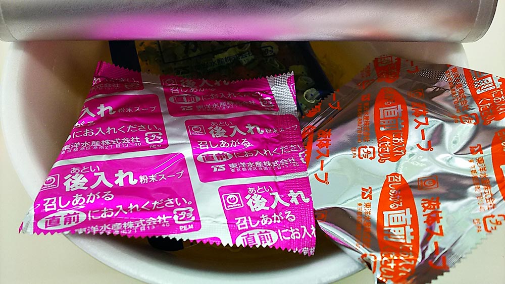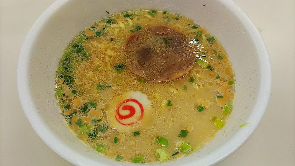 5分経って粉末スープ、液体スープを入れて出来上がりです!