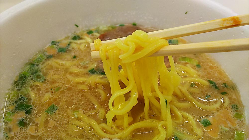 ノンフライ麺は生麺に近い食感で、滑らかでコシがあります!スープは濃厚な豚骨醤油味で、コシがあるノンフライ麺に絡んで美味しいです。